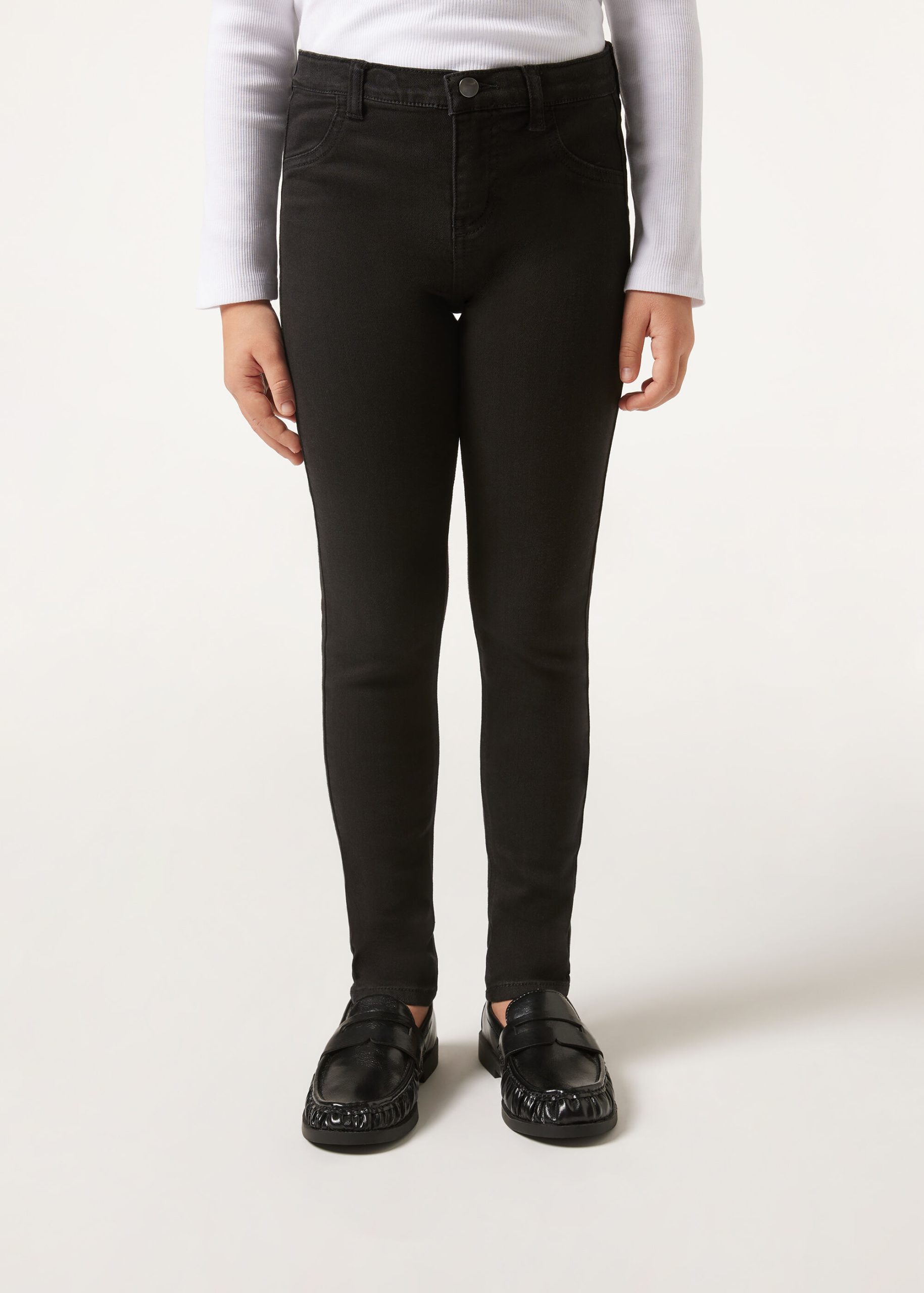 Girls’ skinny jeans in especially soft feel stretch denim with zip and button. Functional adjustable internal drawstring at waist. Faux front pockets and actual back pockets.