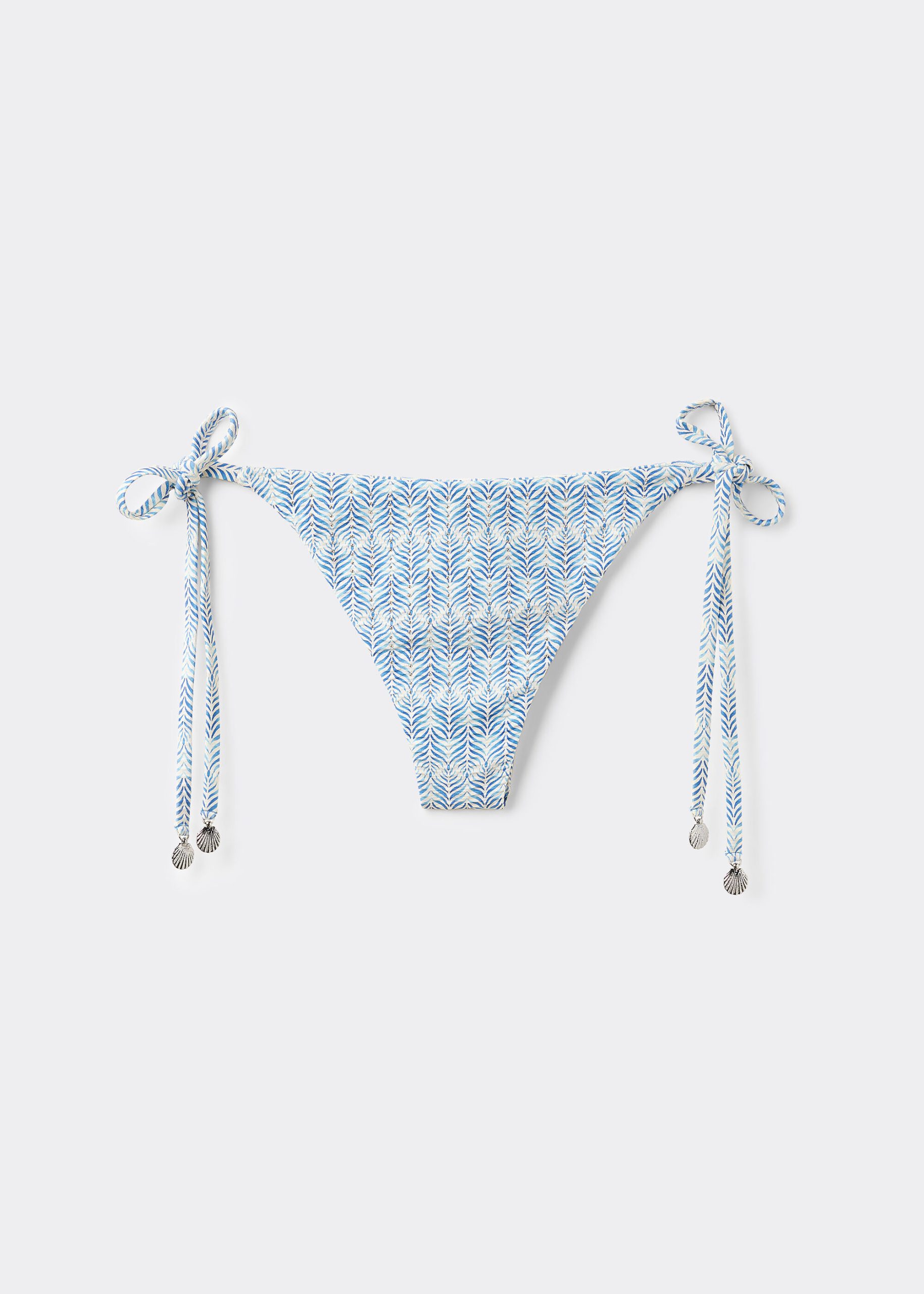 Brazilian cut bikini bottoms with side ties. The slightly rounded waist allows it to be worn either as normal or with the legs higher to show off the physique. A refined white and blue geometric pattern, embellished by micro-beads for a touch of elegance and sophistication. Fully lined with invisible seams.