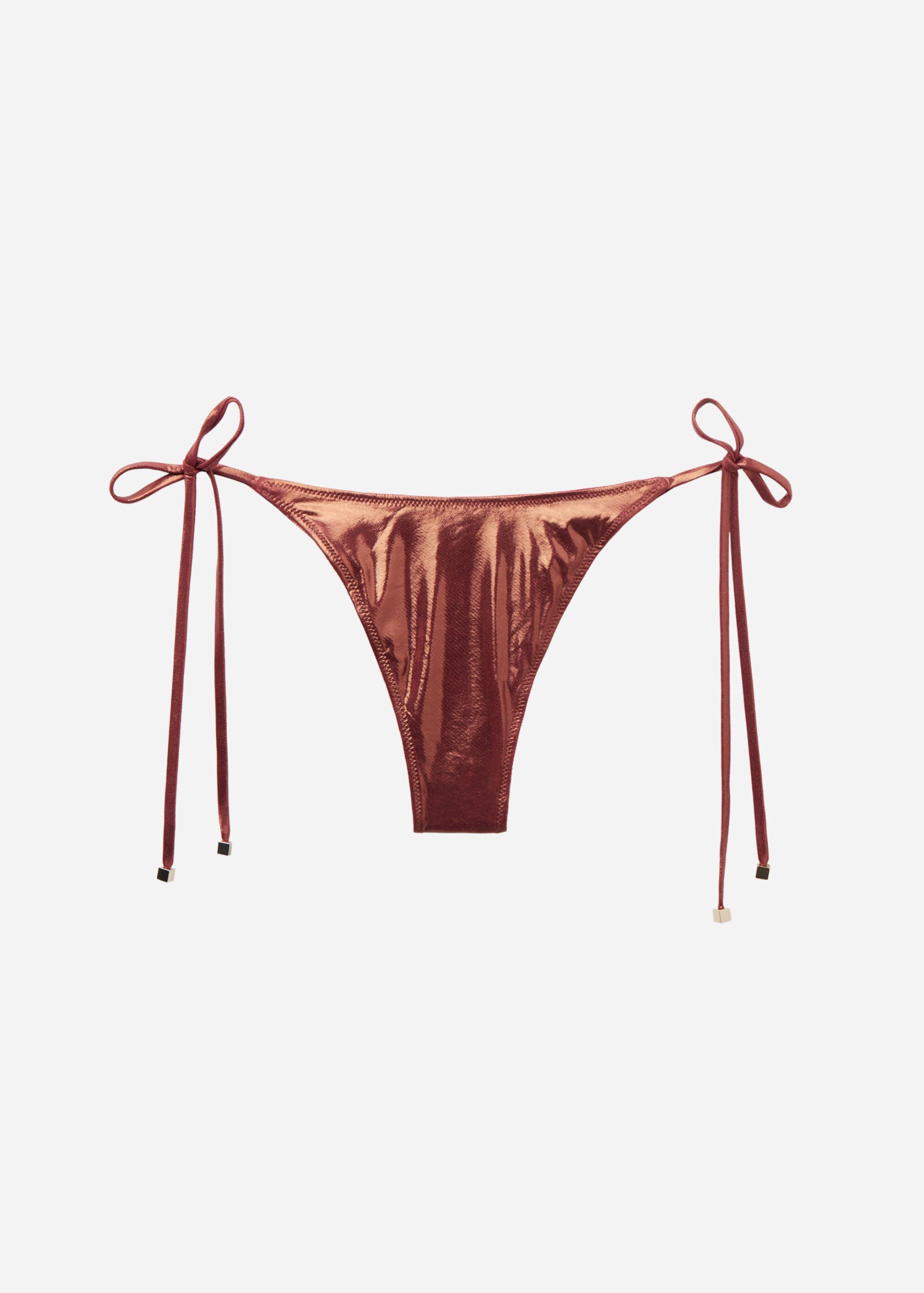 Brazilian bikini bottoms with thin side ties to adjust the fit. The style features an extra shiny, metallic effect fabric. The slightly rounded waist at the front allows for both a regular and more high-cut fit, depending on one’s physique. Fully lined with invisible seams.