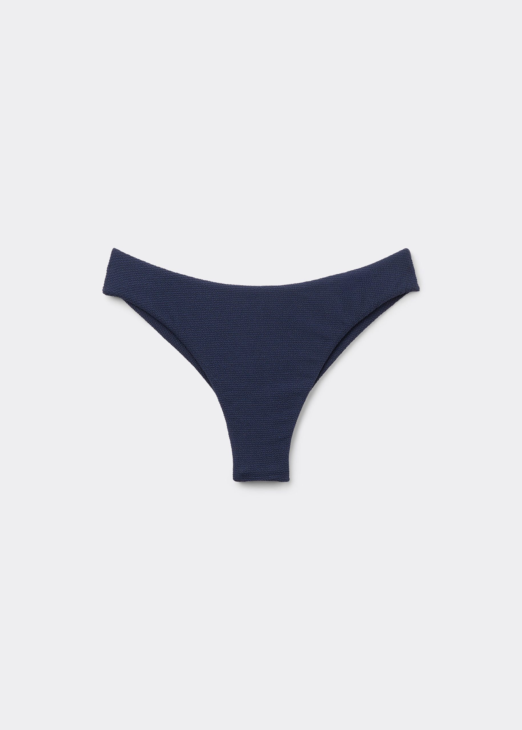 Brazilian bikini bottoms with invisible stitching in order to not leave marks. The slightly rounded waist at the front allows for both a regular and more high-cut fit, depending on one’s physique. The style is defined by a three-dimensional monochrome fabric with a slightly crinkled texture that adds depth and sophistication. Back with central seam that ensures a better fit.