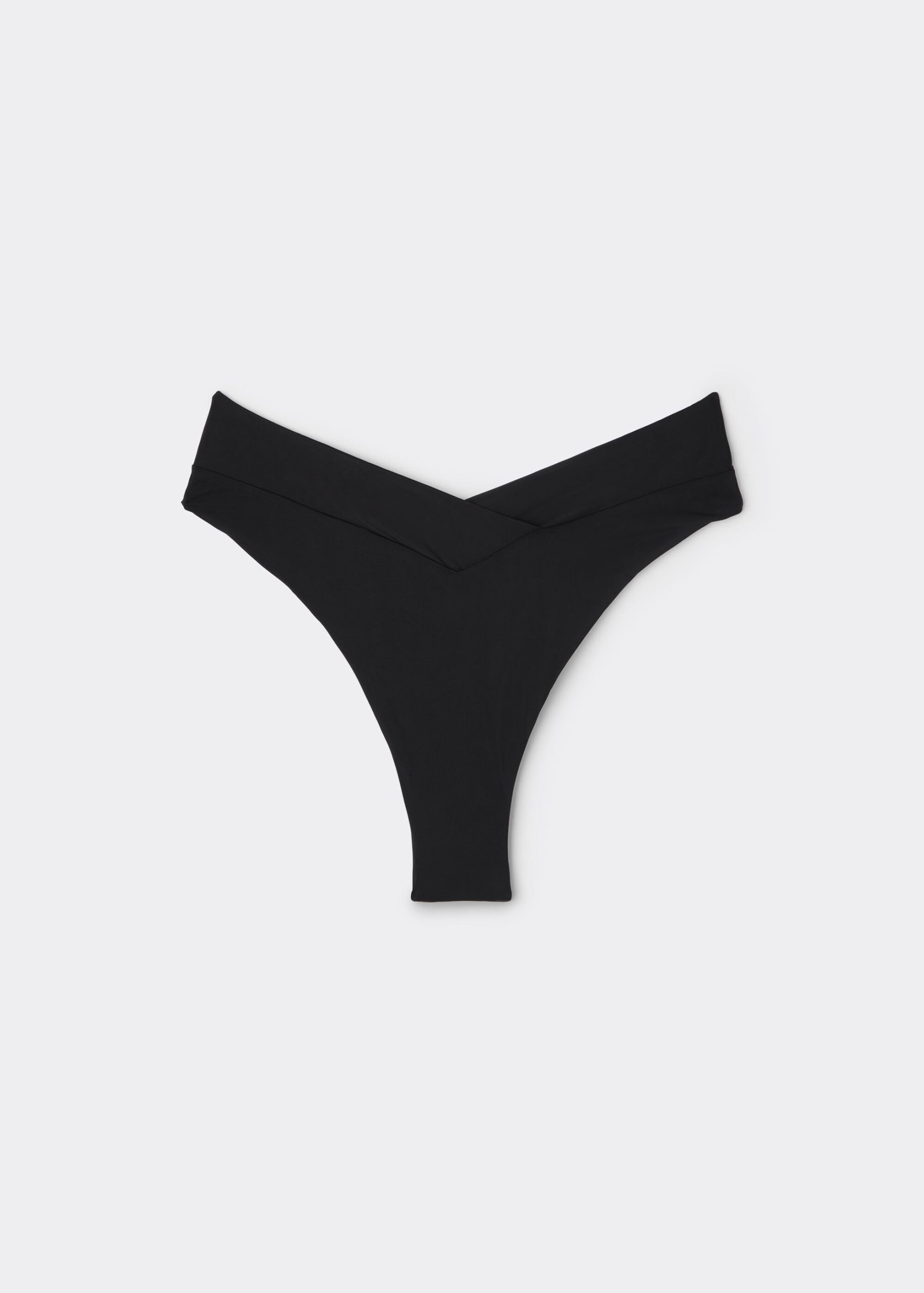 Brazilian bikini bottom with high-waist V-shaped front and back and eighties’ style high-cut legs. The extremely soft fabric makes it pleasant to wear, offering a light and comfortable feel on the skin. Fully lined and with invisible seams.