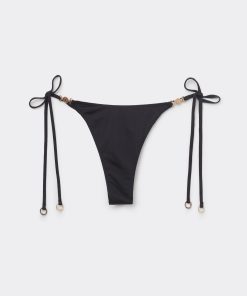 Thong bikini bottoms with side string ties to adjust the fit. It features a minimal fit that exalts the silhouette with a touch of sensuality and refinement. The slightly rounded waist at the front allows for both a regular and more high-cut fit, depending on one’s physique. The bright silk-effect fabric embellished by elegant golden details radiates a sophisticated sensation of discrete luxury. Fully lined with invisible seams.