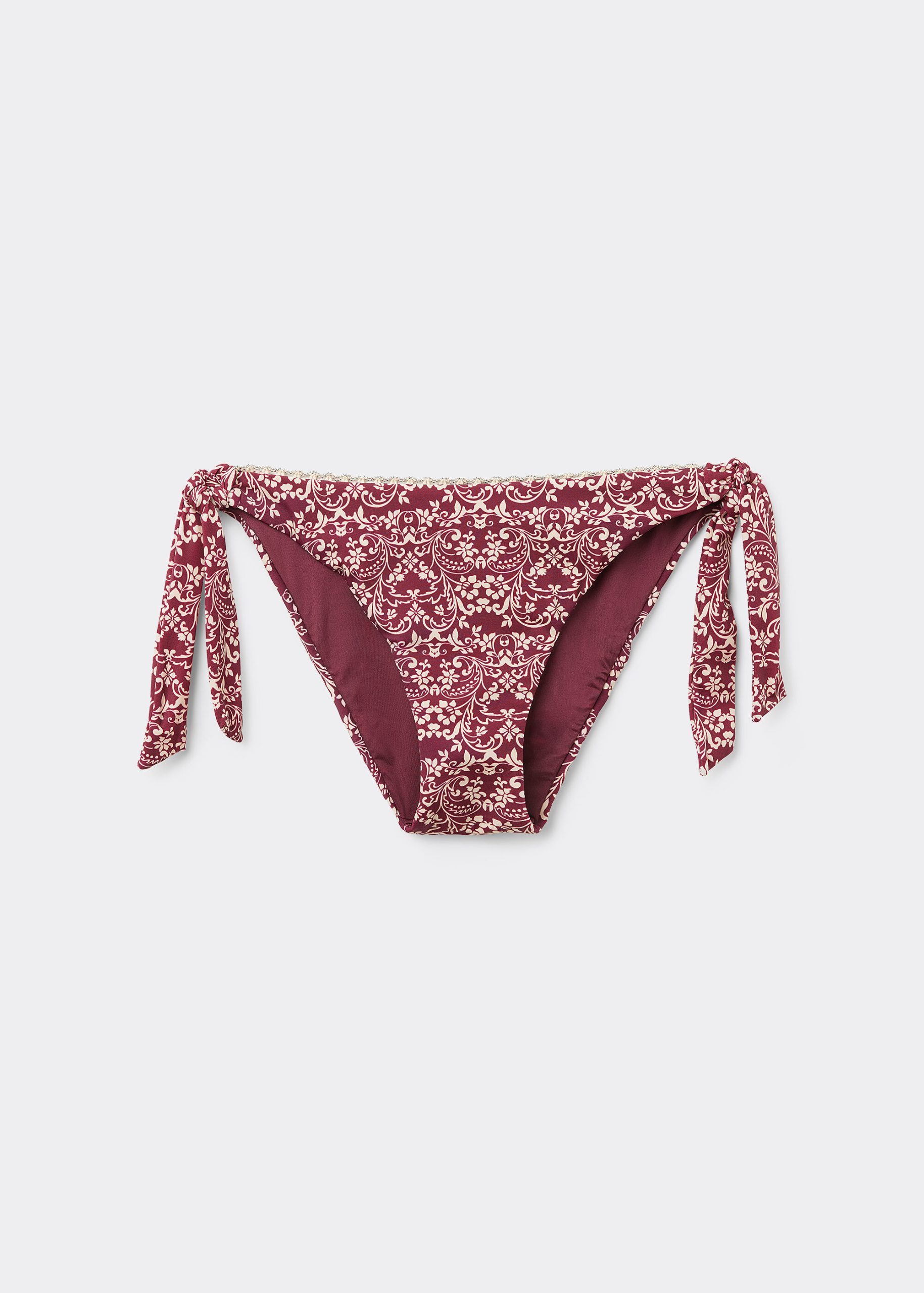 Bikini bottoms with side tie closure to adjust the fit. An elegant floral pattern on a burgundy background, creating a refined and natural look. The slightly rounded waist allows it to be worn either as normal or with the legs higher to show off the physique. Fully lined with invisible seams.
