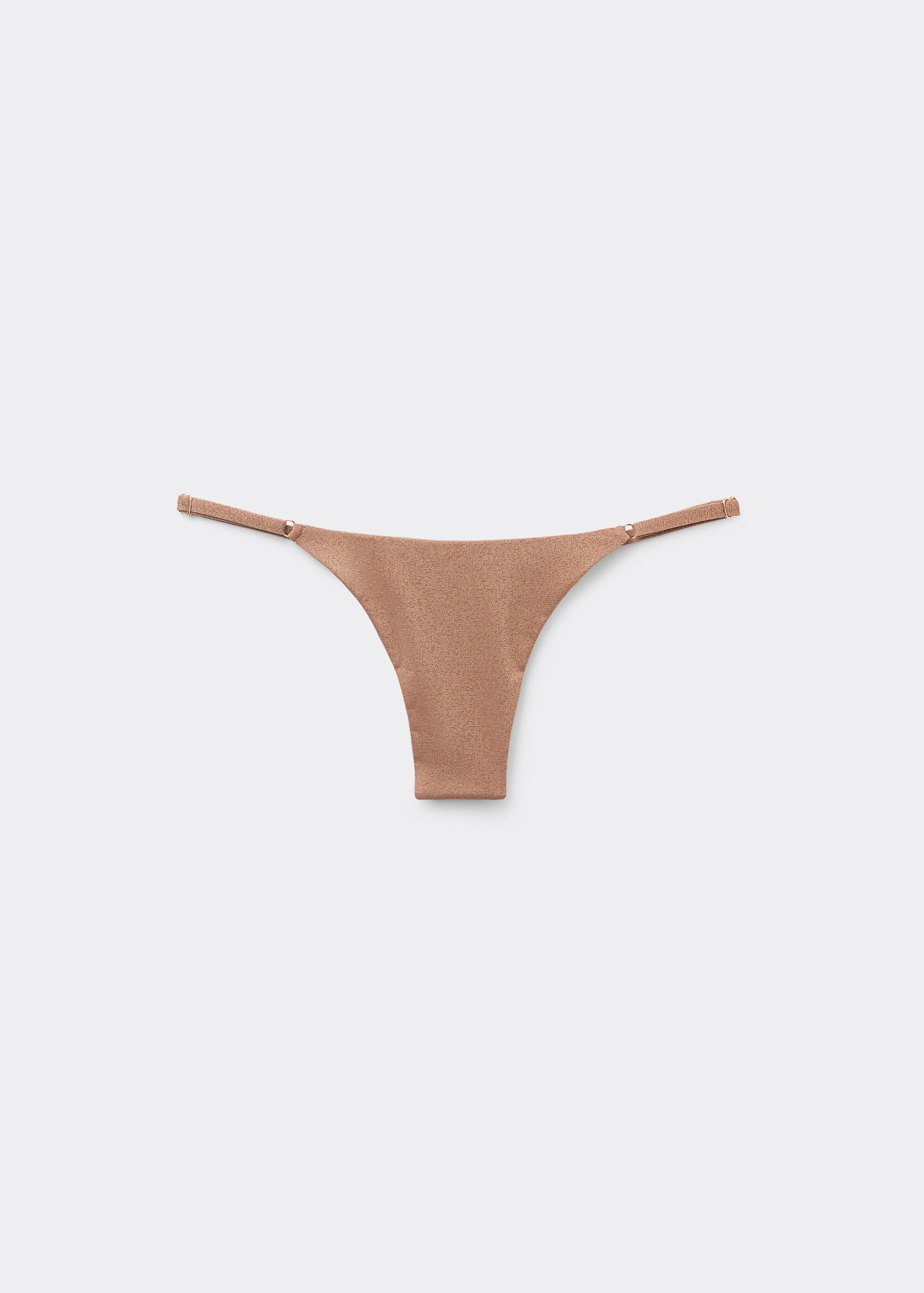 Thong bikini bottoms with adjustable thin sides. The slightly rounded front allows for wearing it either as normal or with the legs higher on the sides to show off the physique. The style features soft fabric with shiny lamé thread. Fully lined with invisible seams.