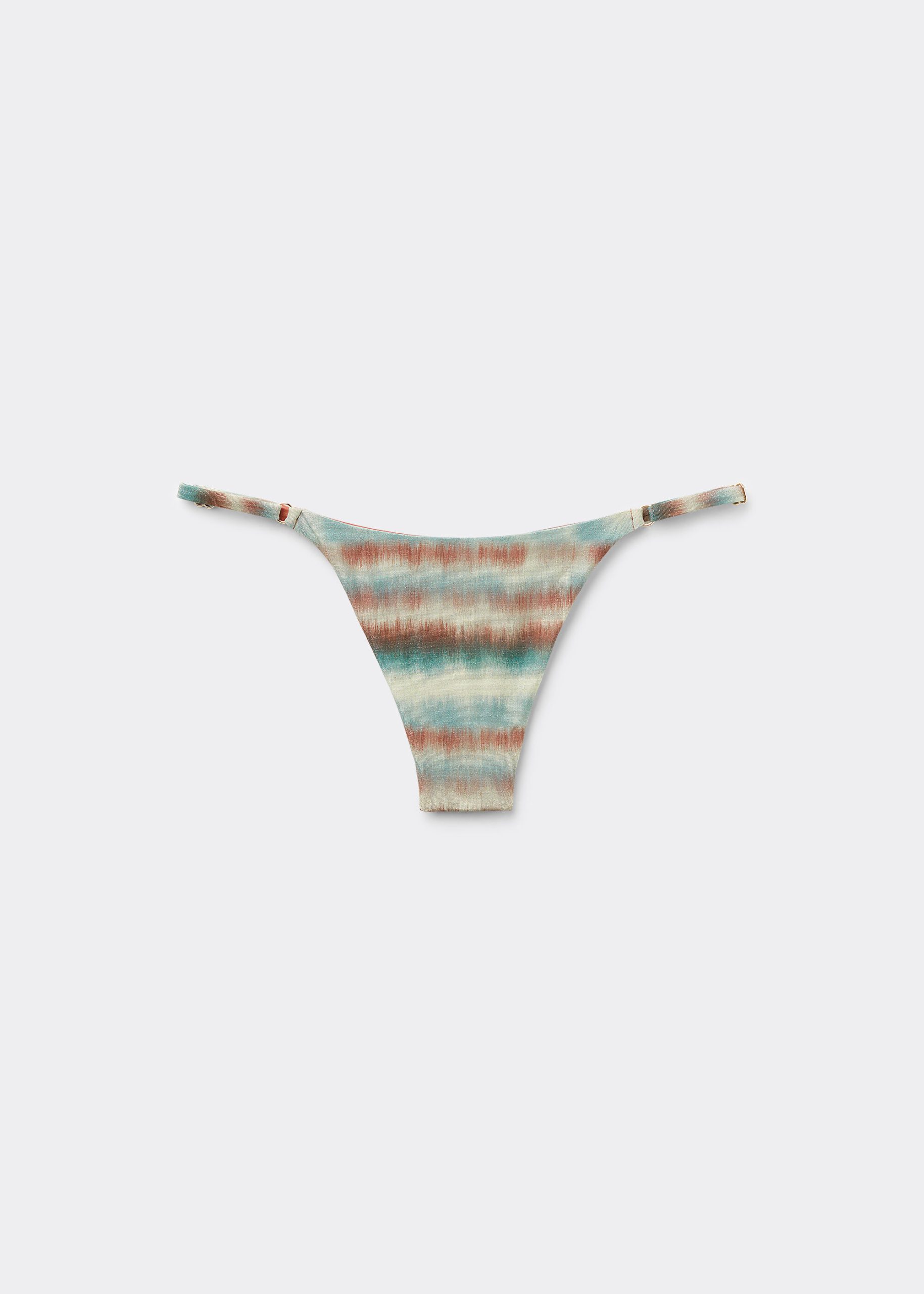 Thong bikini bottoms with adjustable side panels. The slightly rounded waist at the front allows for both a regular and more high-cut fit, depending on one’s physique. Bright and colorful tie-dye motif embellished with glittery details, on a soft and shimmery fabric, ideal for a bold and original look. Fully lined with invisible seams.