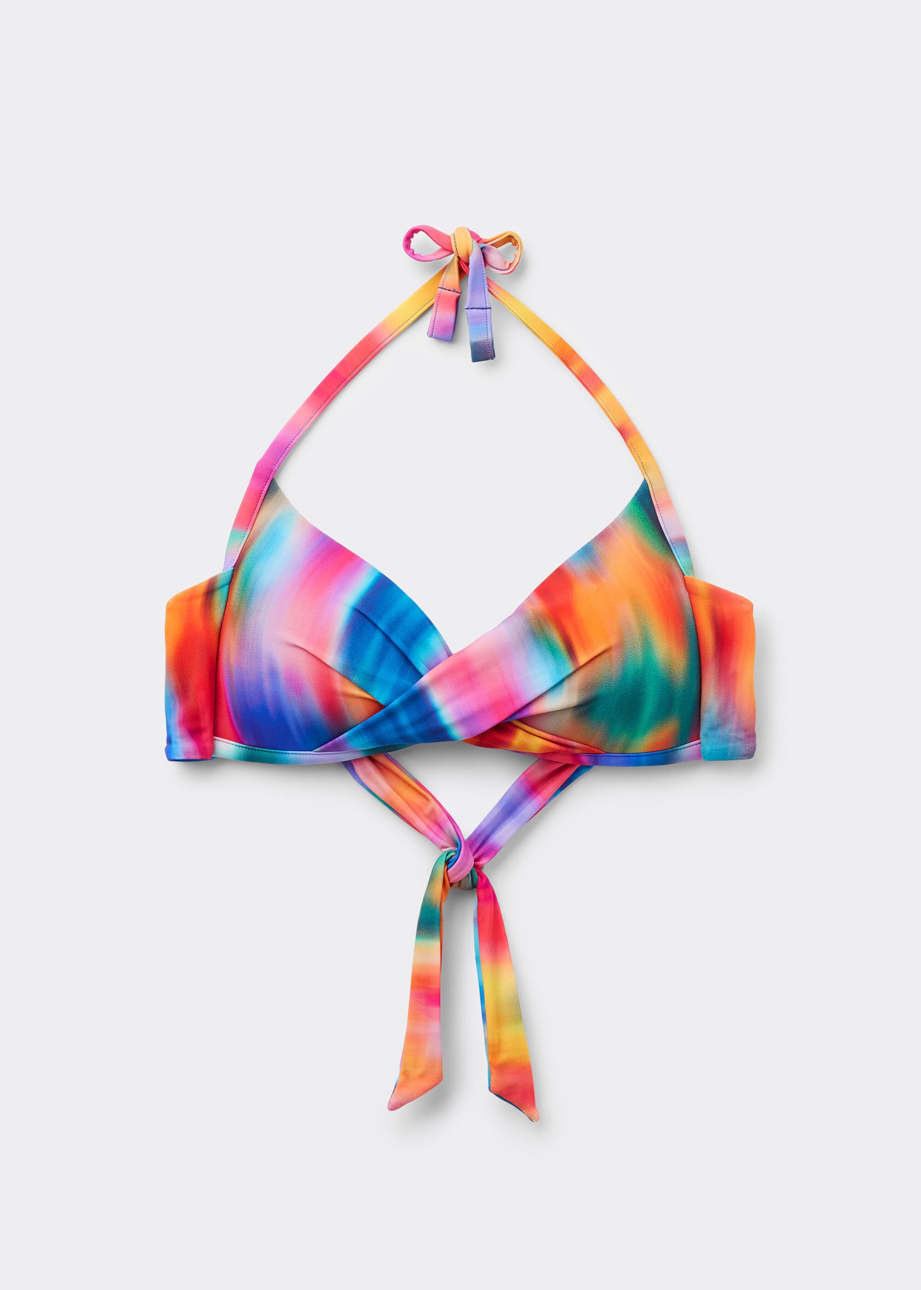 Wireless fixed triangle bikini top with graduated padded cups that add volume. The crisscross on the neckline enhances the décolleté. A colorful fabric full of bold and bright rainbow shades that blend fluidly for a dynamic and luminous effect. Back tie closure. The cups in size XLu002F40 are lightly padded.