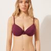 Push-up bikini top with lightly padded cups and underwire to guarantee support and provide volume. The style features a bright fabric with a silky effect. Fixed Shoulder Straps. Rear closure with double adjustment hook.