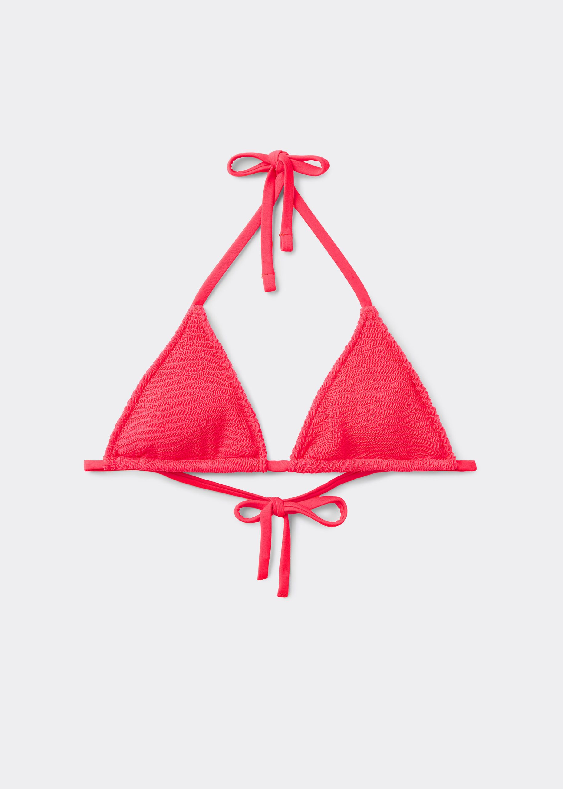 Slide triangle bikini top with removable cups and no underwire for a natural effect. The style features a crinkle fabric with a three-dimensional effect. The shoulder straps have eyelets on the ends so they can be hooked onto the back band or tied behind the neck. Back string tie closure.