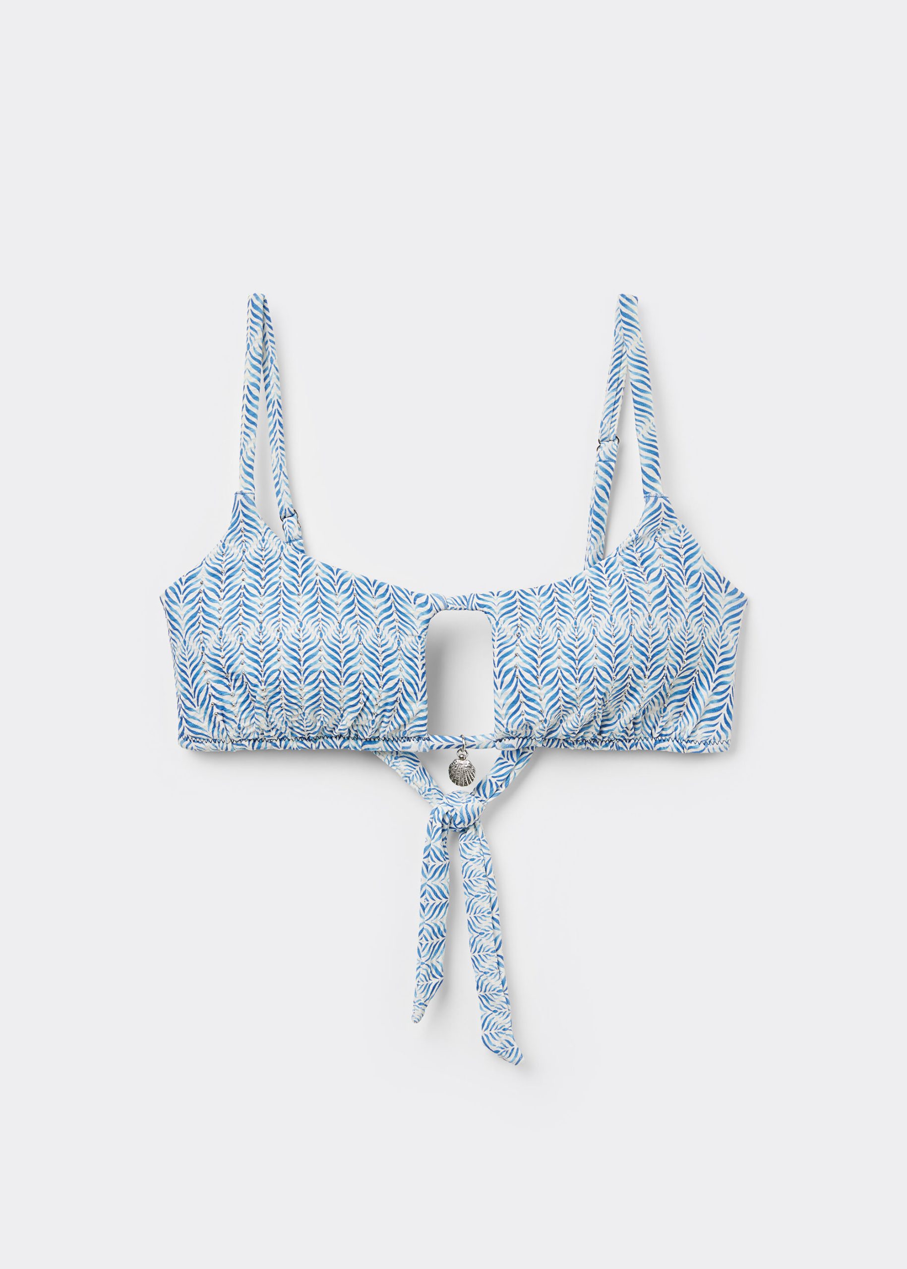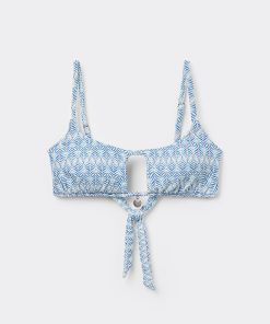 Tank-style bikini top with light padding, no underwire and opening in the center. A refined geometric pattern in delicate shades of white and blue, embellished by micro-beads that add a touch of elegance and sophistication. The side boning helps support the bust. Adjustable thin straps. Back tie closure.