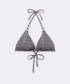 Slide triangle bikini top with removable padding, wireless for a natural effect. The style features a black and white toned pattern embellished with a coated effect. The shoulder straps have eyelets on the ends so they can be hooked onto the back band or tied behind the neck. Back string tie closure.