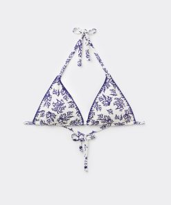 Slide triangle bikini top with removable cups and no underwire for a natural effect. A marine blue coral print on slightly crinkled fabric, which creates a fresh, refined and dynamic effect. The shoulder straps have eyelets on the ends so they can be hooked onto the back band or tied behind the neck. Back string tie closure.