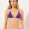 Slide triangle bikini top with removable padding, wireless for a natural effect. Made from soft microfiber, the top is embellished with a vibrant multi-colored striped pattern, which adds a touch of freshness and color to the look. The shoulder straps have eyelets on the ends so they can be hooked onto the back band or tied around the neck. Back string tie closure.