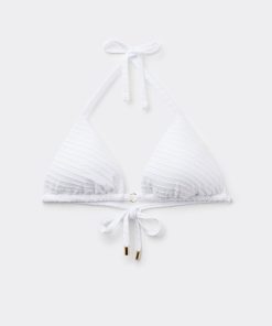 Slide triangle bikini top with removable padding and no underwire for a natural effect. The style features a particularly soft three-dimensional diagonal-motif fabric. The shoulder straps have eyelets on the ends so they can be hooked onto the back band or tied behind the neck. Back string tie closure embellished with silver tips.