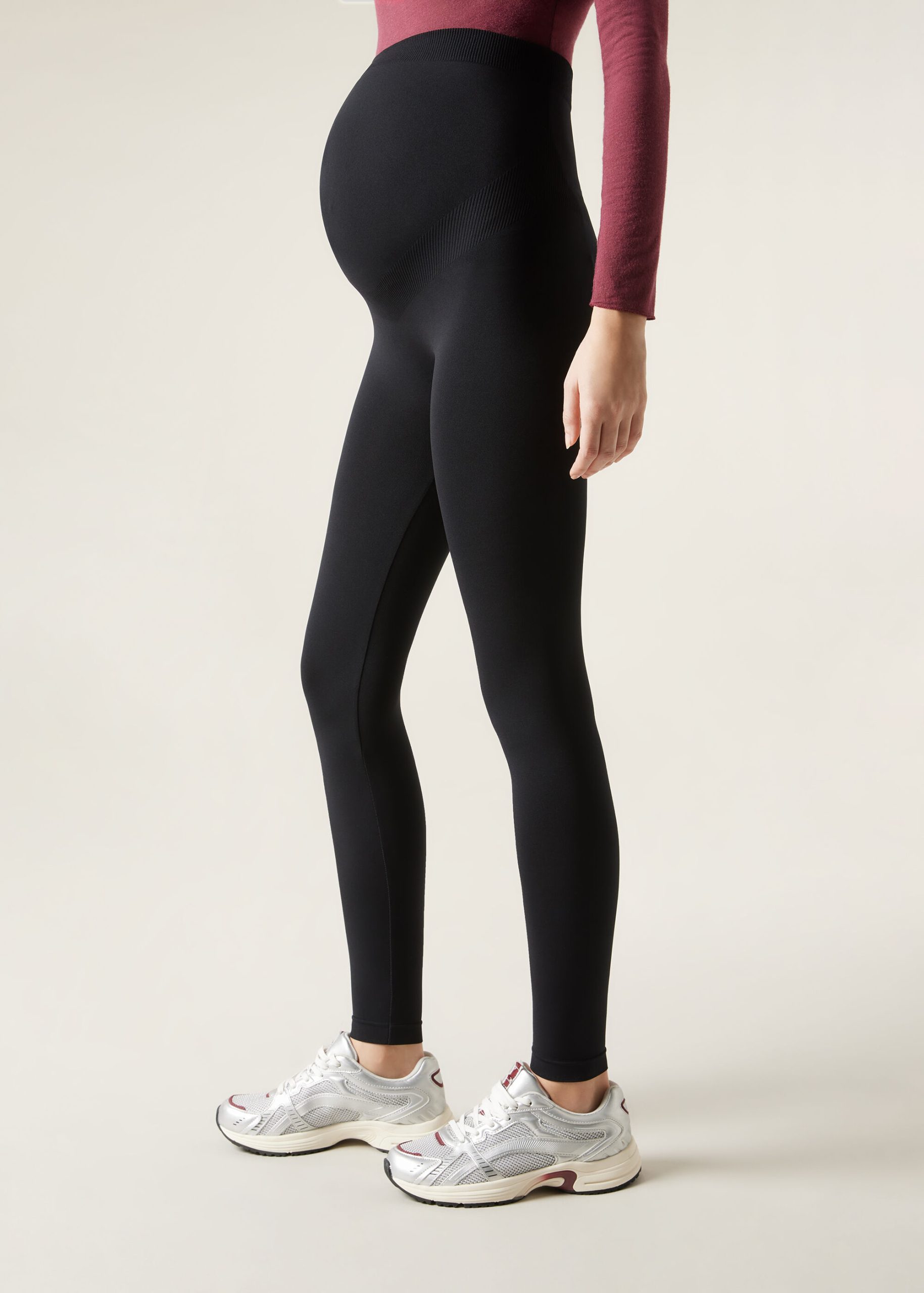 100-denier microfiber leggings with seamless brief and front anatomical panel that adapts to the shape of the stomach during pregnancy. Soft-touch material on the legs for a smooth, comfortable feel.