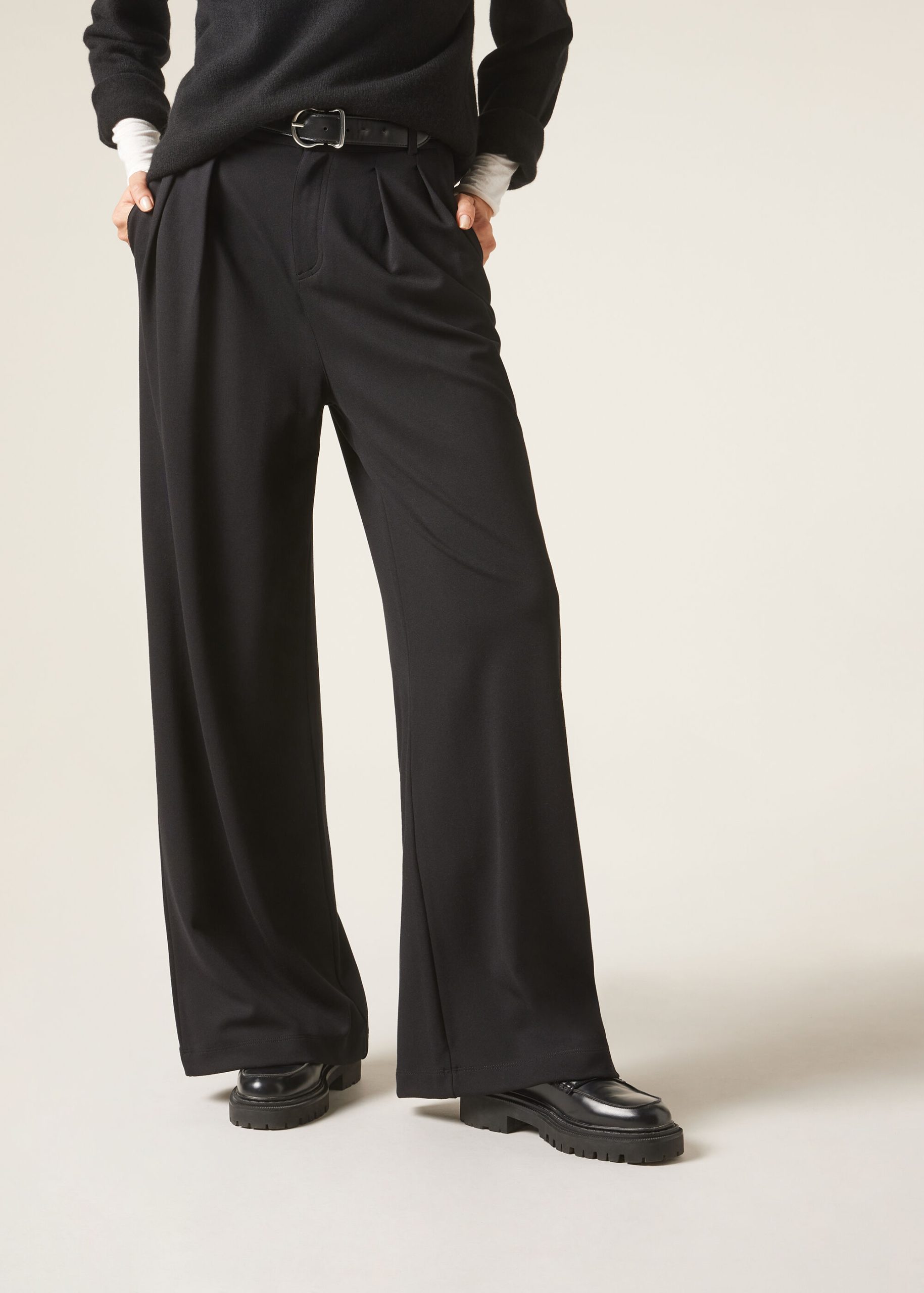 Women’s palazzo pants made of soft and comfortable punto milano fabric. This elegant and classic palazzo pant design offers an especially comfortable and versatile fit, ideal for any occasion. Featuring a zipper, button, and belt loops, they also have pleats and front slant pockets, and faux back pockets that create a clean and elegant line.