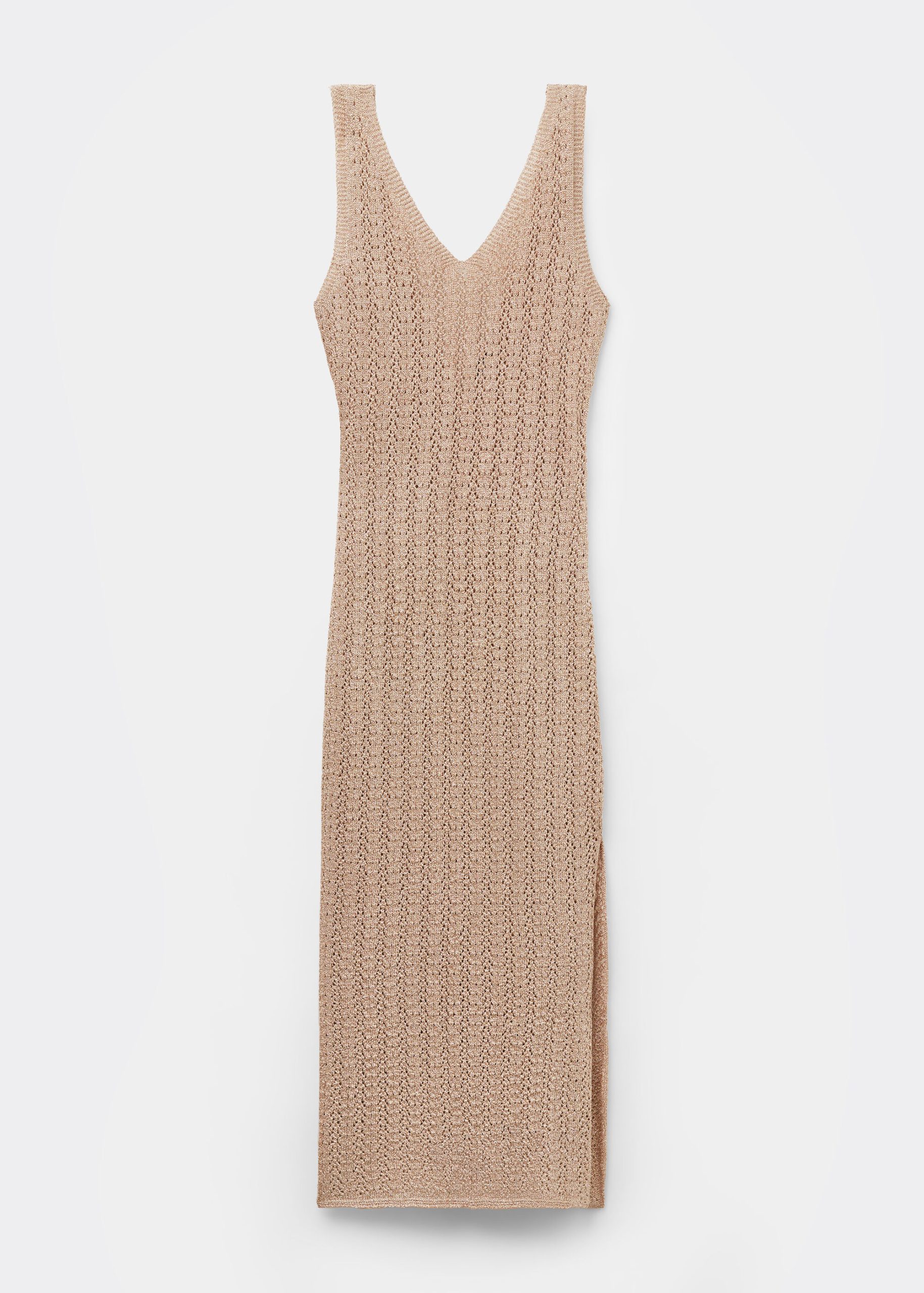 Maxi dress crocheted in refined golden lamè, featuring and elegant V neckline on both the front and back. The sophisticated side slits provide movement and lightness, exalting the silhouette. Perfect for sophisticated and versatile looks, ideal to wear on top of beachwear or for special chic appeal occasions.