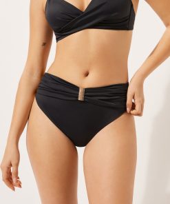 High-waisted bikini bottoms with draping and mobile golden accessory with a shaping effect on the abdomen. The compact fabric, designed to exalt and enhance the body’s curves, ensures excellent containment on the abdomen and is studied to make every woman feel at ease without constraint. Fully lined with invisible seams.