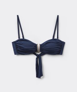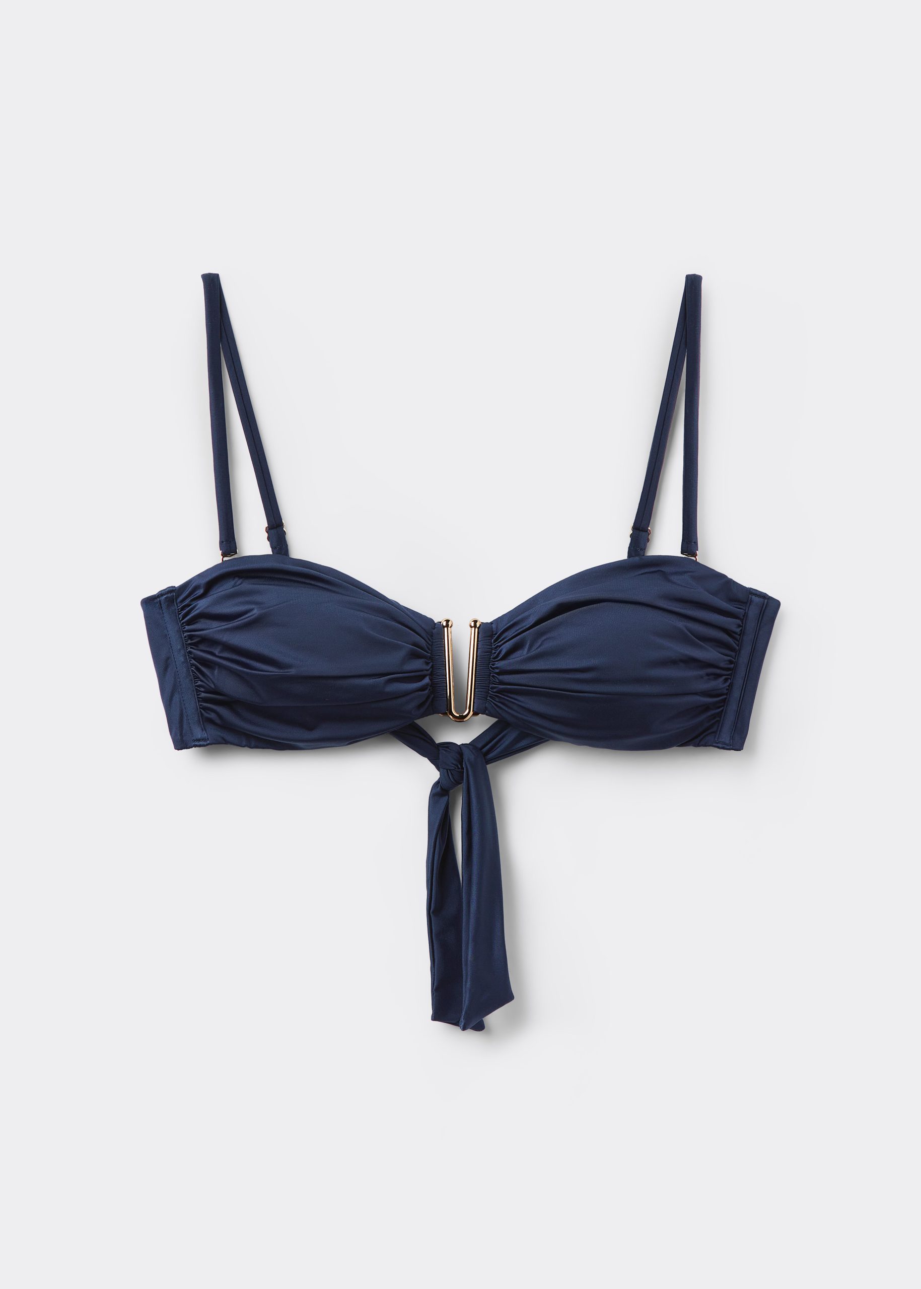Bandeau bikini top with lightly padded cups. The side boning guarantees good support. The style features shiny fabric with a golden accessory at the center of the bust. Adjustable and removable straps. Back tie closure.