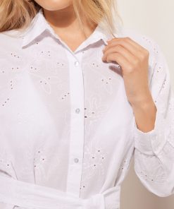 Long shirt in broderie anglaise, perfect for those who love the coolness and lightness of natural fibers. Featuring a front button fastening, a classic shirt collar, long sleeves and a belt at the waist to emphasize the silhouette. Ideal for a sophisticated look, it adapts to all summer occasions with style and grace.