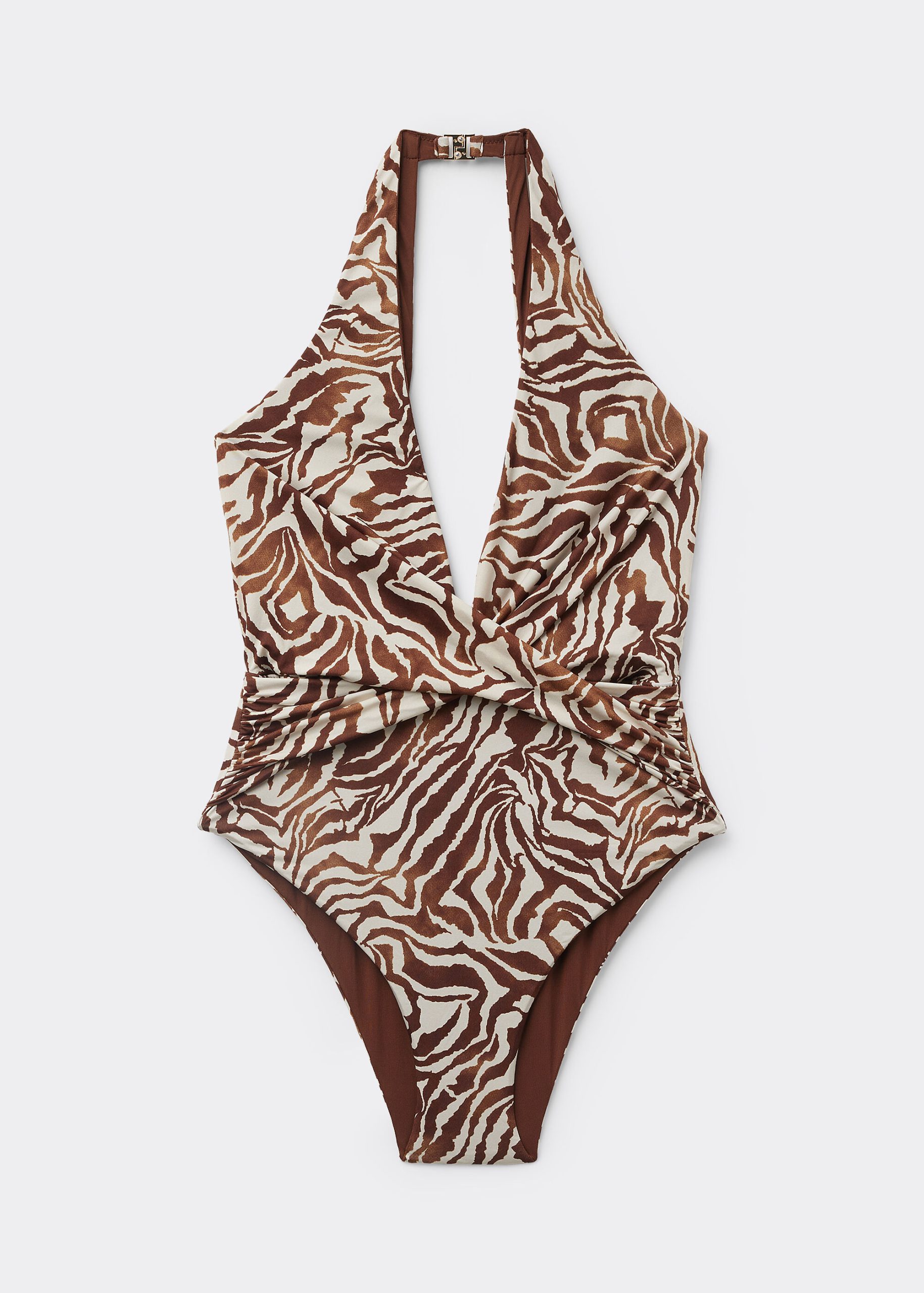 One piece swimsuit, wireless and unpadded for a natural effect. The style features a deep front surplice neckline and a sophisticated Brown Zebra print. Fully lined and invisible stitching in order to not mark the figure. Slightly high cut legs with regular back coverage.