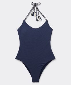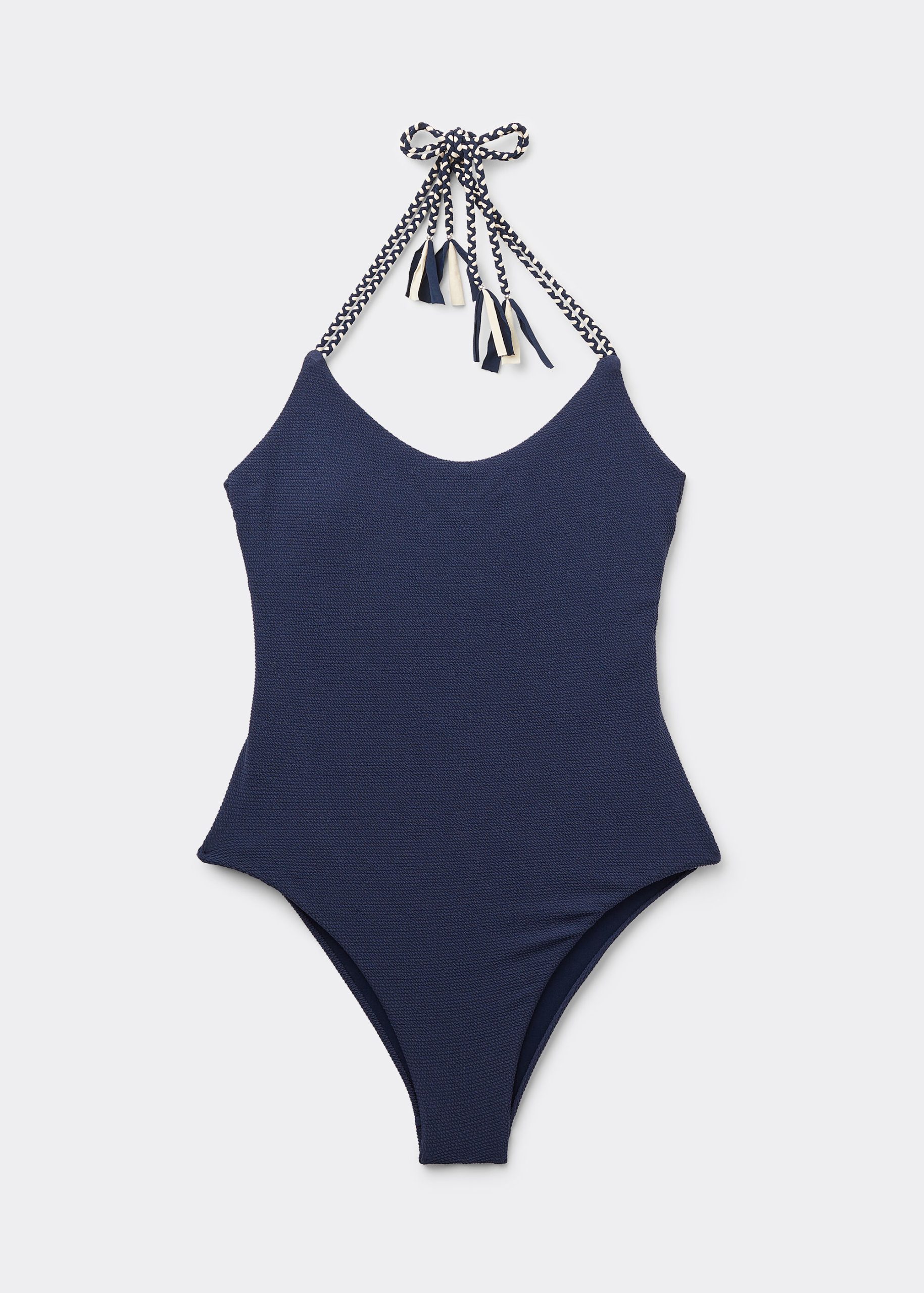 One piece swimsuit, wireless and unpadded for a natural and comfortable effect. It features a two-tone string fastening behind the neck and an elegant crinkled fabric with a 3D look. The braided string tied at the waist adds a touch of refinement. The regular fit on the bottom and classic design make it perfect for any occasion at the beach.