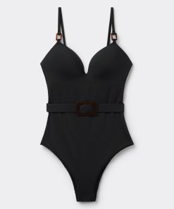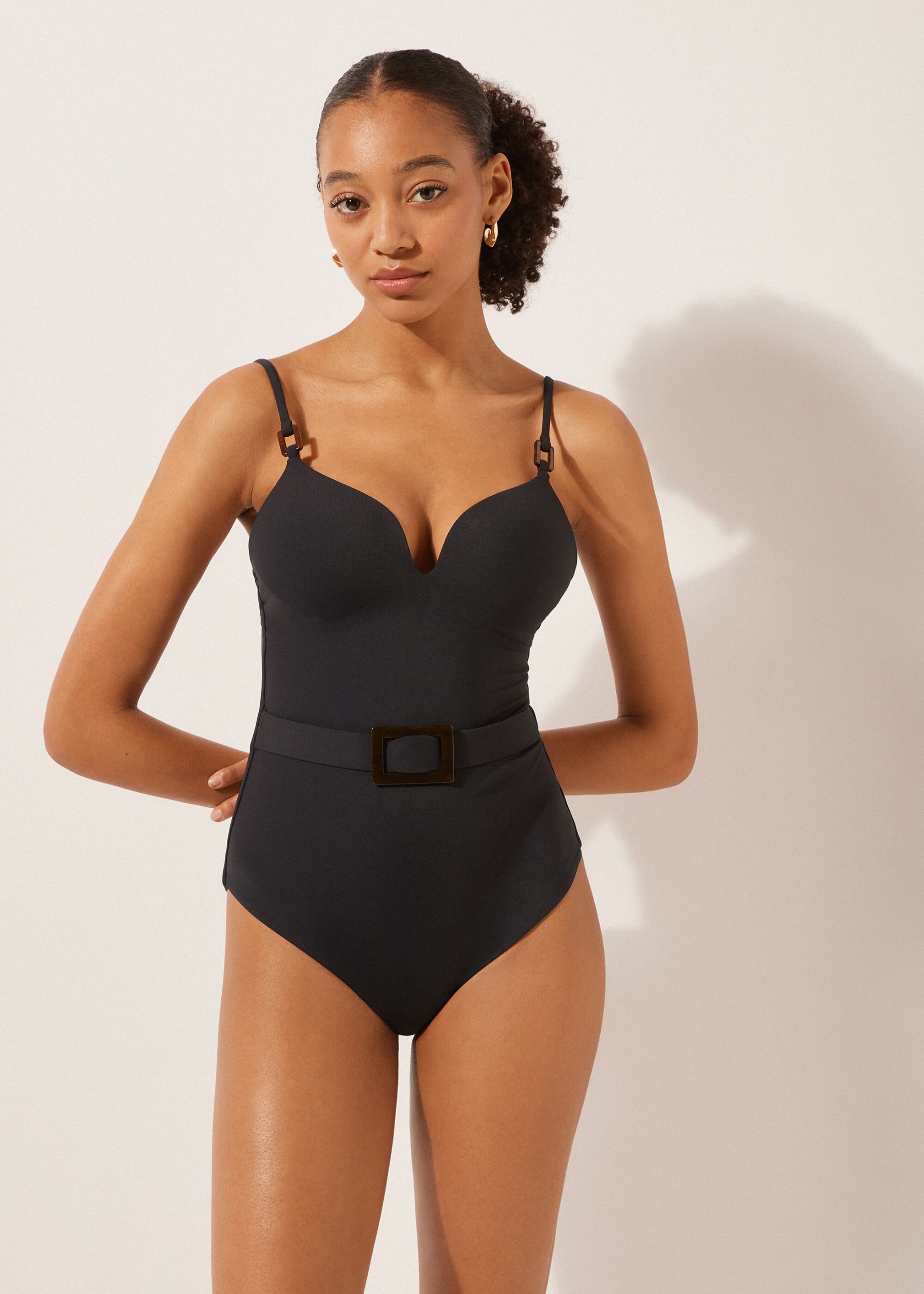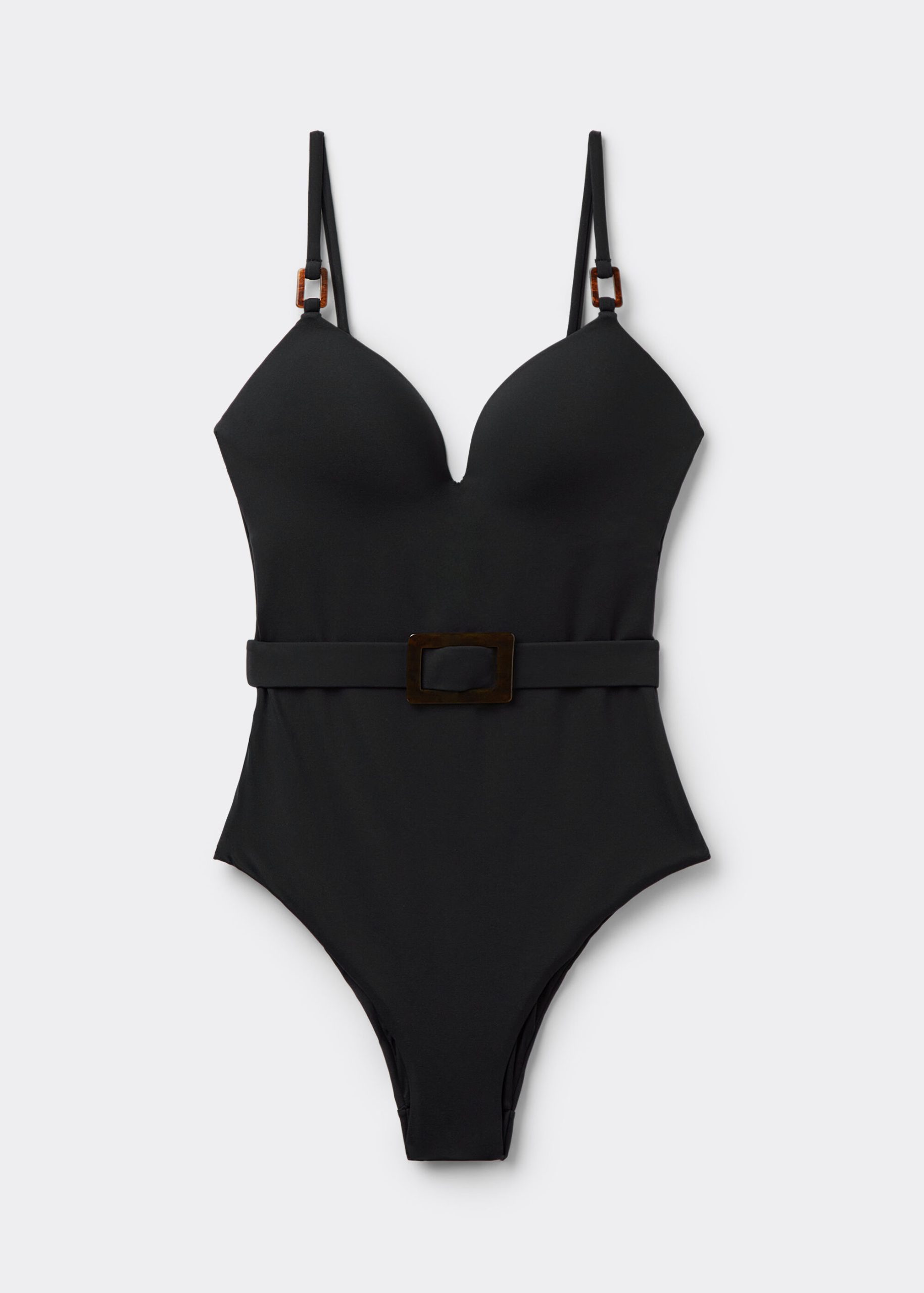 One-piece wireless swimsuit with heart neckline and lightly padded cups. Embellished by tortoiseshell color accessories and a decorative belt on the front that adds an elegant and sophisticated touch. Adjustable shoulder straps. Regular fit on the back.