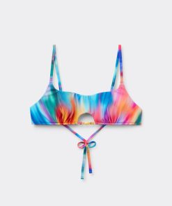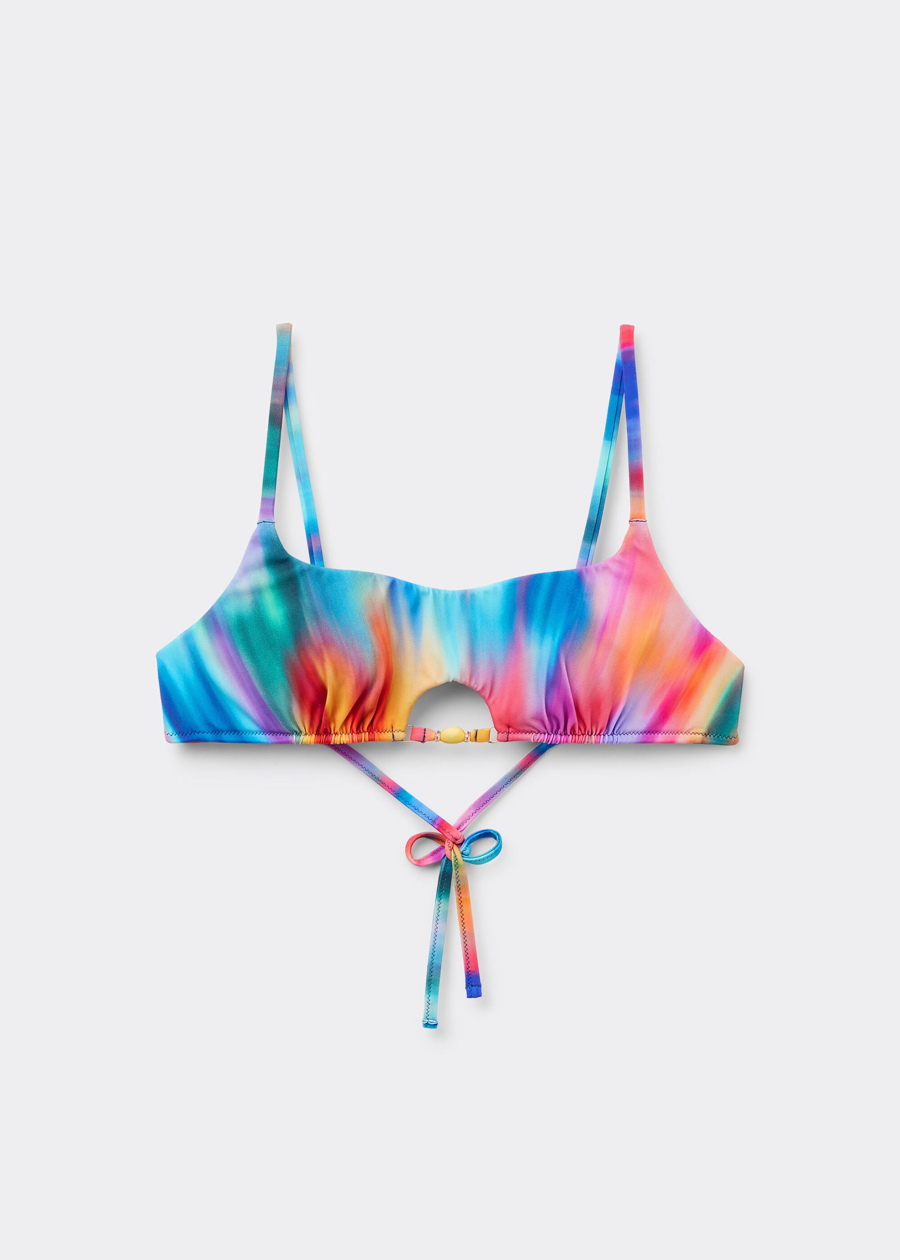 Wireless tank-style bikini top with lightly padded cups. The side boning helps to support the bust. The style features an opening at the center of the bust with small gold ring details. Made from soft microfiber, the top is embellished with a multi-colored pattern in bright rainbow shades, which adds a touch of energy and shininess to the look. Adjustable shoulder straps and back string tie closure.